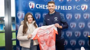 A representative of the company is pictured below, receiving a signed replica shirt from Zach Hemming, who was named Man of the Match.